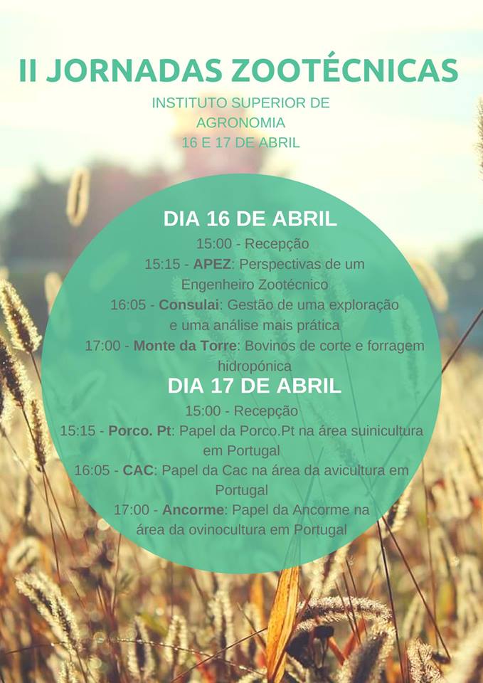 O ZootecnISA vai levar a cabo a sua 2ª edição das Jornadas Zootécnicas, nos próximos dias 16 e 17 de Abril. Constituídas por dois dias de palestras, irão estar representadas várias empresas do sector, e serão abordadas diferentes realidades da Pecuária a Nível Nacional.
