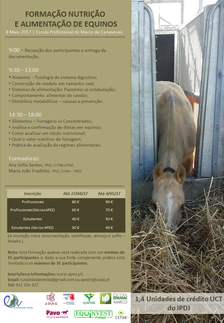 A APEZ em colaboração com a Ruralidade Verde e a EPAMAC, levaram a efeito, no dia 8 de Maio de 2017 uma Formação em Nutrição e Alimentação de Equinos, no Marco de Canaveses. Contamos com a Ana Sofia Santos e Maria João Fradinho como oradoras.