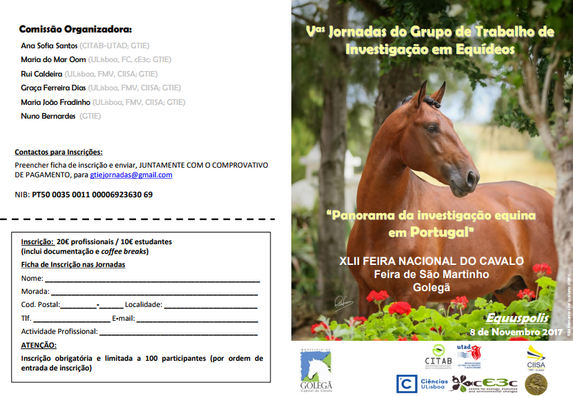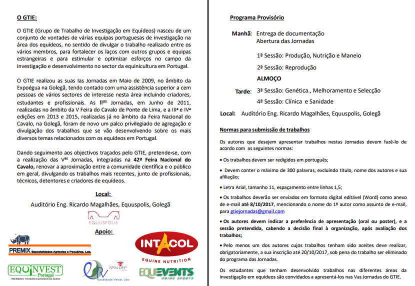 O Grupo de Trabalho de Investigação em Equídeos (GTIE) vem por este meio relembrar a realização das V Jornadas do GTIE, na Golegã, no próximo dia 8 de novembro, por ocasião da XLII Feira Nacional do Cavalo. Por solicitação de alguns autores, informamos que alargámos o prazo de submissão de trabalhos até dia 8 de outubro. Assim, reenviamos o folheto de apresentação das Jornadas, o qual inclui as normas para submissão de resumos.