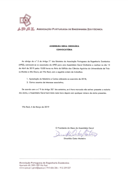 No próximo dia 13 de Abril de 2019, pelas 10h00, na nossa sede (Átrio do Ed. Ciências Agrárias ,UTAD, Vila Real) contamos consigo para a Assembleia Geral Ordinária com a seguinte ordem de trabalhos: ,