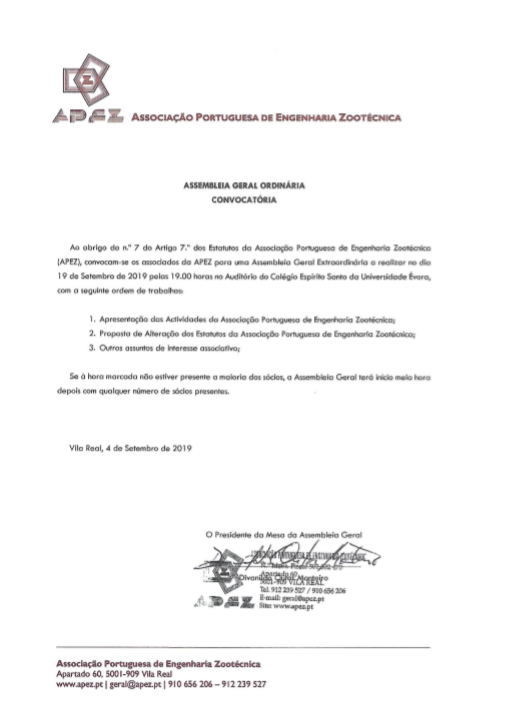 - Proposta de Alteração dos Estatutos da Associação Portuguesa de Engenharia Zootécnica;
